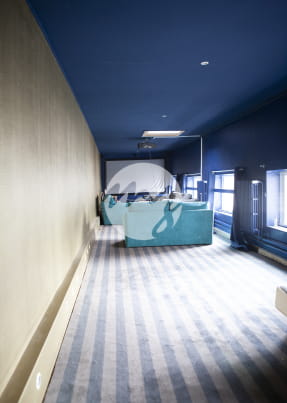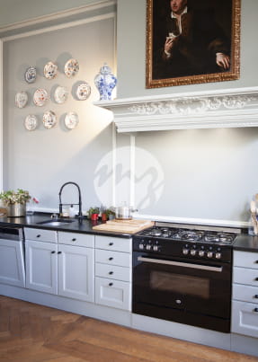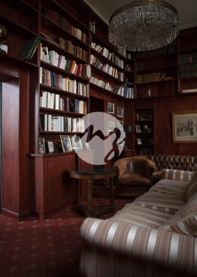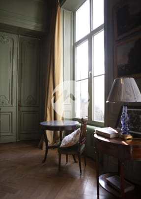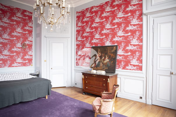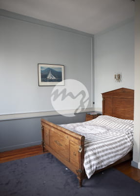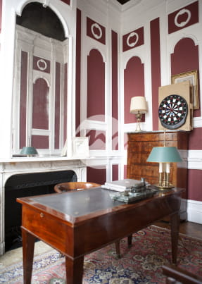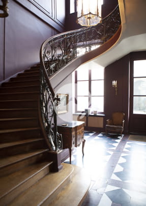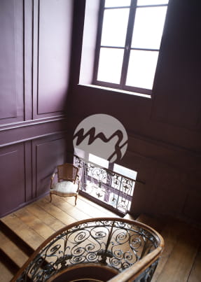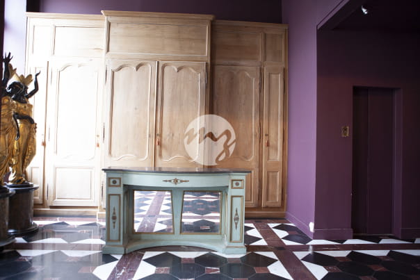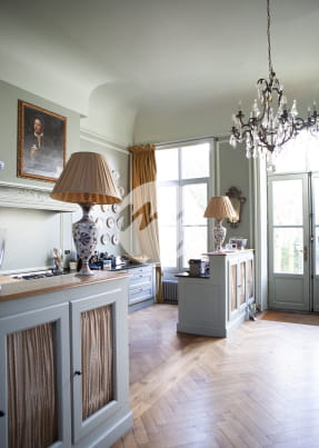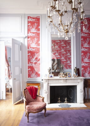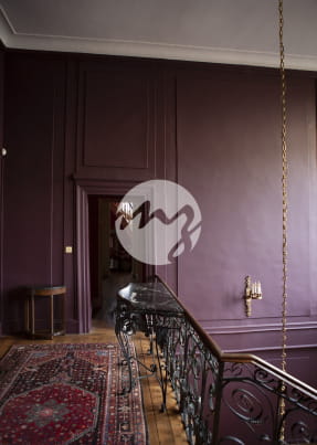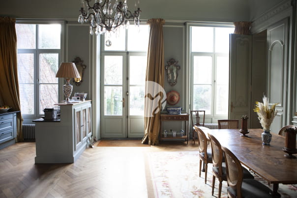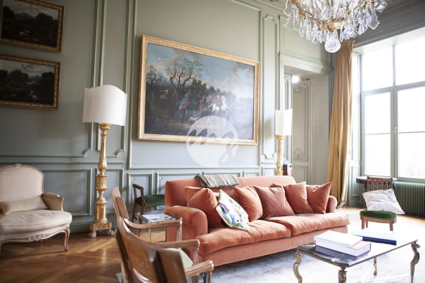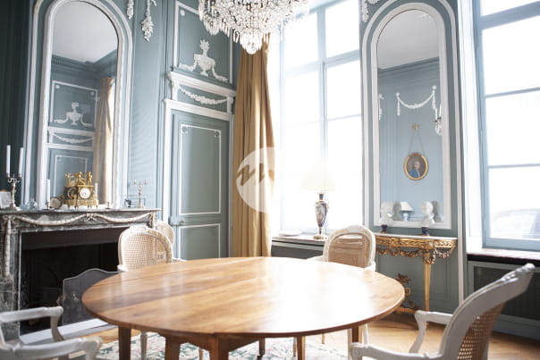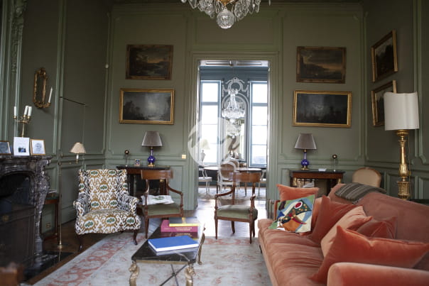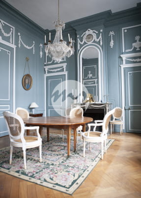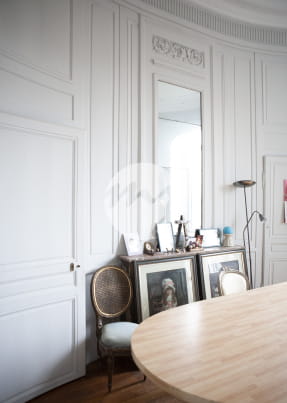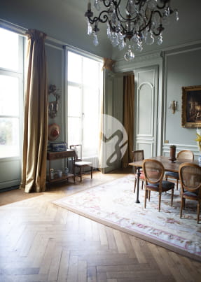 Salon de 8M sur 6M, salle à manger 5,50M sur 6M murs colorés avec moulures, au sol un parquet chevrons couleur miel.
